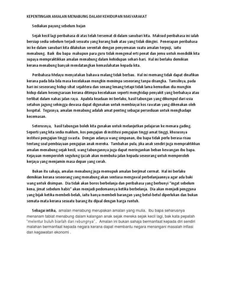 Contoh karangan kepentingan amalan menabung dan menyimpan wang. 'sediakan payung sebelum hujan' merupakan peribahasa yang sinonim dengan amalan menabung atau menyimpan wang. Hal ini kerana menabung merupakan alternatif untuk menambah pendapatan dengan menyimpan wang di bank secara berterusan dan dalam jangka masa panjang. Kebaikan dan keburukan internet kepada pelajar.